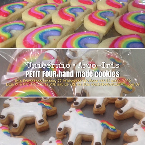 Festa Arco-Iris cheia de biscoitos coloridos e unicórnios para a mesa de doces e lembrancinhas! Informações contato@petitfour.com.br Fone +55 11 4999-7009